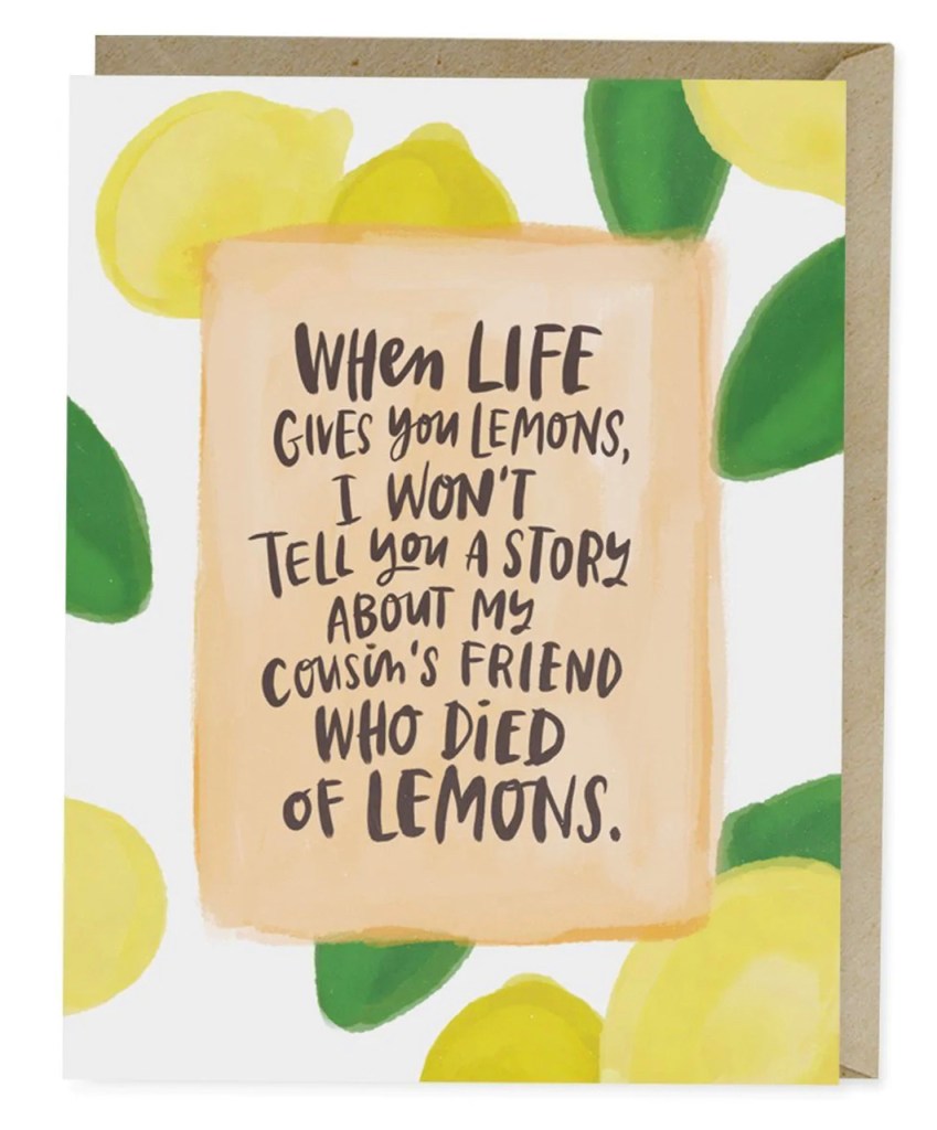 “When life gives you lemons, I won’t tell you a story about my cousin’s friend who died of lemons…” Strangely, weird cancer humor as it is, quite true quite often I now can attest.