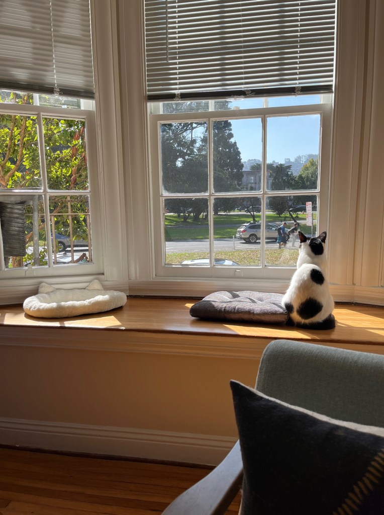 New apartment. In August, my cat and I moved! It’s a charming place in a 6-unit “building” built in the 1900s with all the old San Francisco charm and details. We are in love with our new neighborhood just steps from Golden Gate Park. We have lovely neighbors — some have lived here a decade, some 2, raise kids here, nearly everyone has a pet. It’s a light-filled apartment with large bay windows (overlooking The Panhandle) that my cat loves to watch the world from.